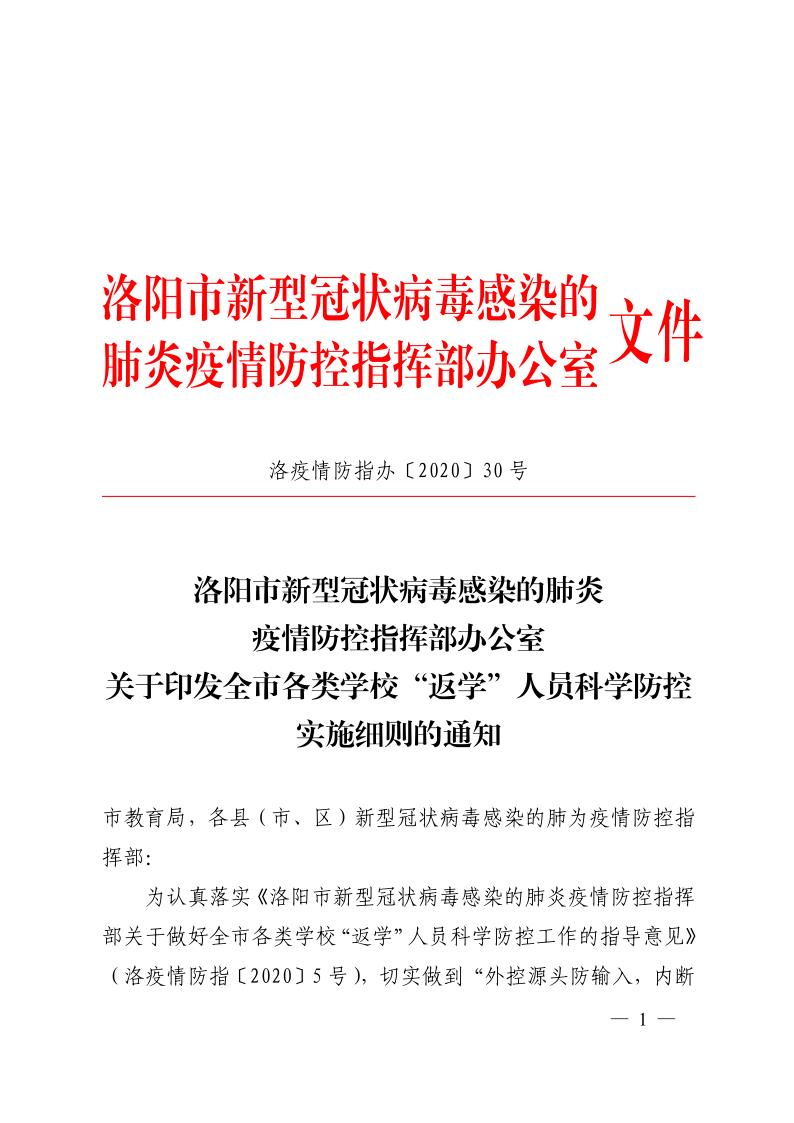洛疫情防指办〔2020〕30号--关于印发全市各类学校“返学”人员科学防控实施细则的通知